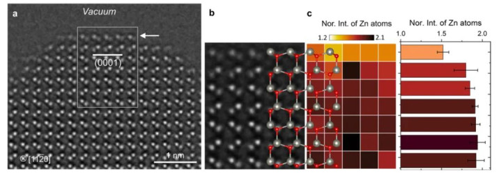 图2. 原始ZnO(0001)表面的高分辨率透射电子显微镜(HRTEM)图像及锌原子柱强度的定量分析。DOI: 10.1038/s41467-022-33353-2
