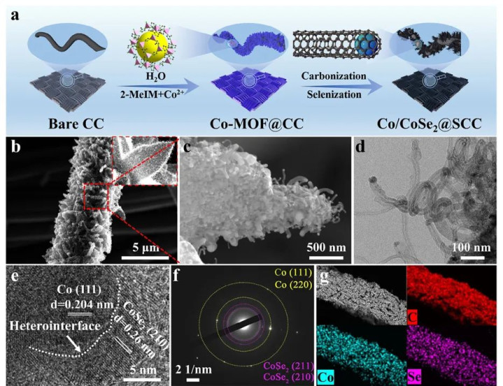 图3. Co/CoSe2@SCC的制备与表征。a)Co/CoSe2@SCC合成过程示意图。b)Co/CoSe2@SCC的SEM图像及c)对应局部放大细节。d-f)Co/CoSe2@SCC的TEM、HRTEM和SAED图像。g) Co/CoSe2@SCC样品的EDS能谱映射图像。DOI: 10.1002/aenm.202502425