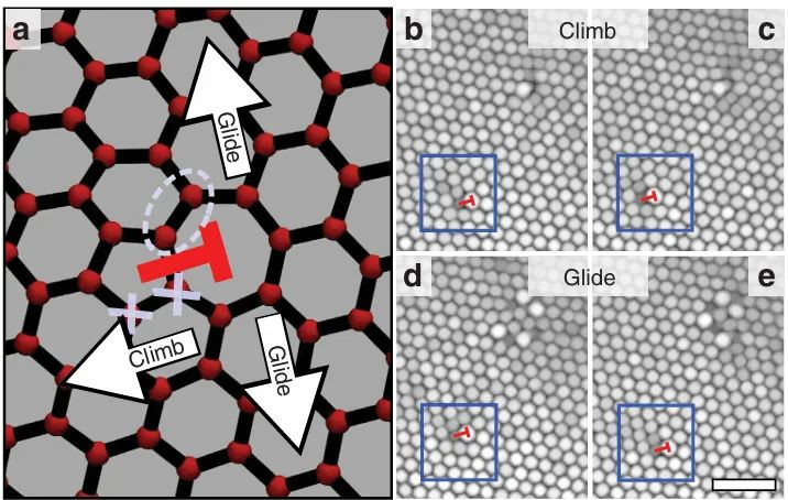 图4. 石墨烯中位错的迁移。(a)示意性地展示了可能的运动方向:一个晶面高度的攀移需要移除两个碳原子(以叉号标记)。(b)和(c)经最大滤波处理的AC-HRTEM图像,展示了基本攀移步骤的实际过程。(d)和(e)显示了一个滑移步骤。DOI: 10.1038/ncomms3098
