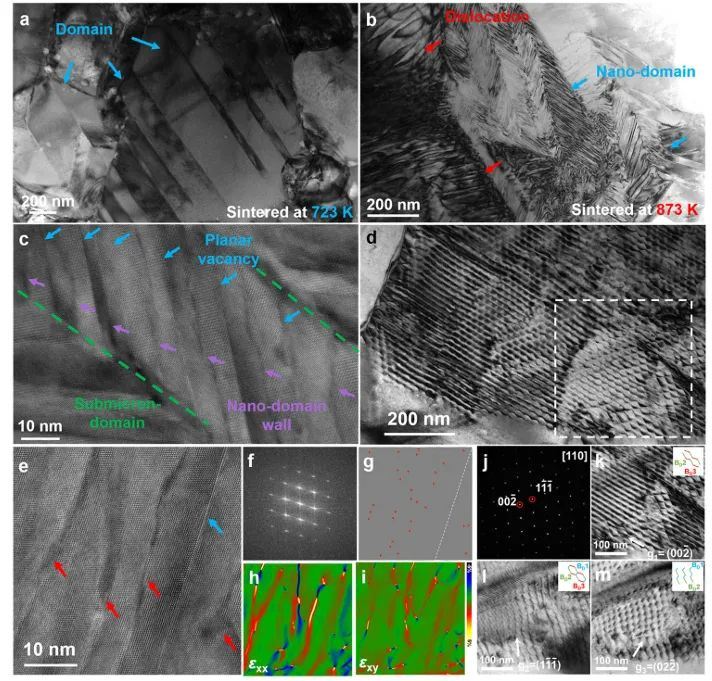 图6. a,b)低倍TEM图像;C)图b中随机选取区域的HRTEM图像;d)873K烧结样品中位错网络的低倍TEM图像;e)位错与平面空位的HRTEM图像;f)图e的快速傅里叶变换(FFT)图像;g)图e的逆快速傅里叶变换(IFFT)图像;(h)和(i)通过几何相位分析(GPA)验证的沿xx方向和xy方向的应变分布图;j)图d中白色虚线框标注区域的选区电子衍射(SAED)图谱。k-m)图d中框区在三种不同衍射条件下的放大图像。DOI: 10.1038/s41467-022-33774-z